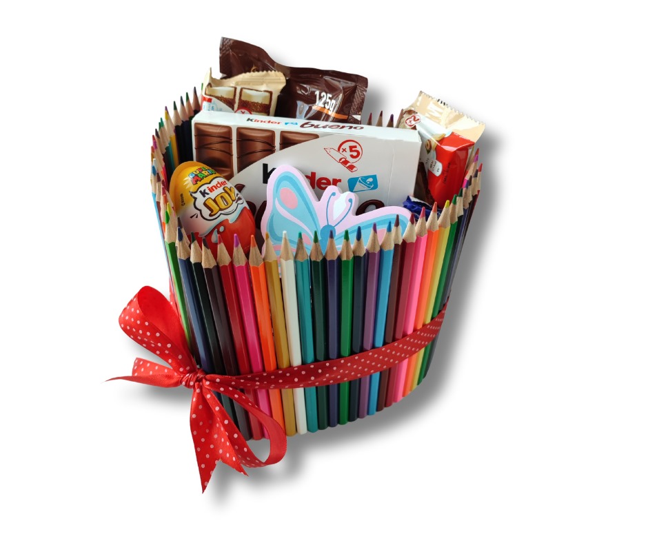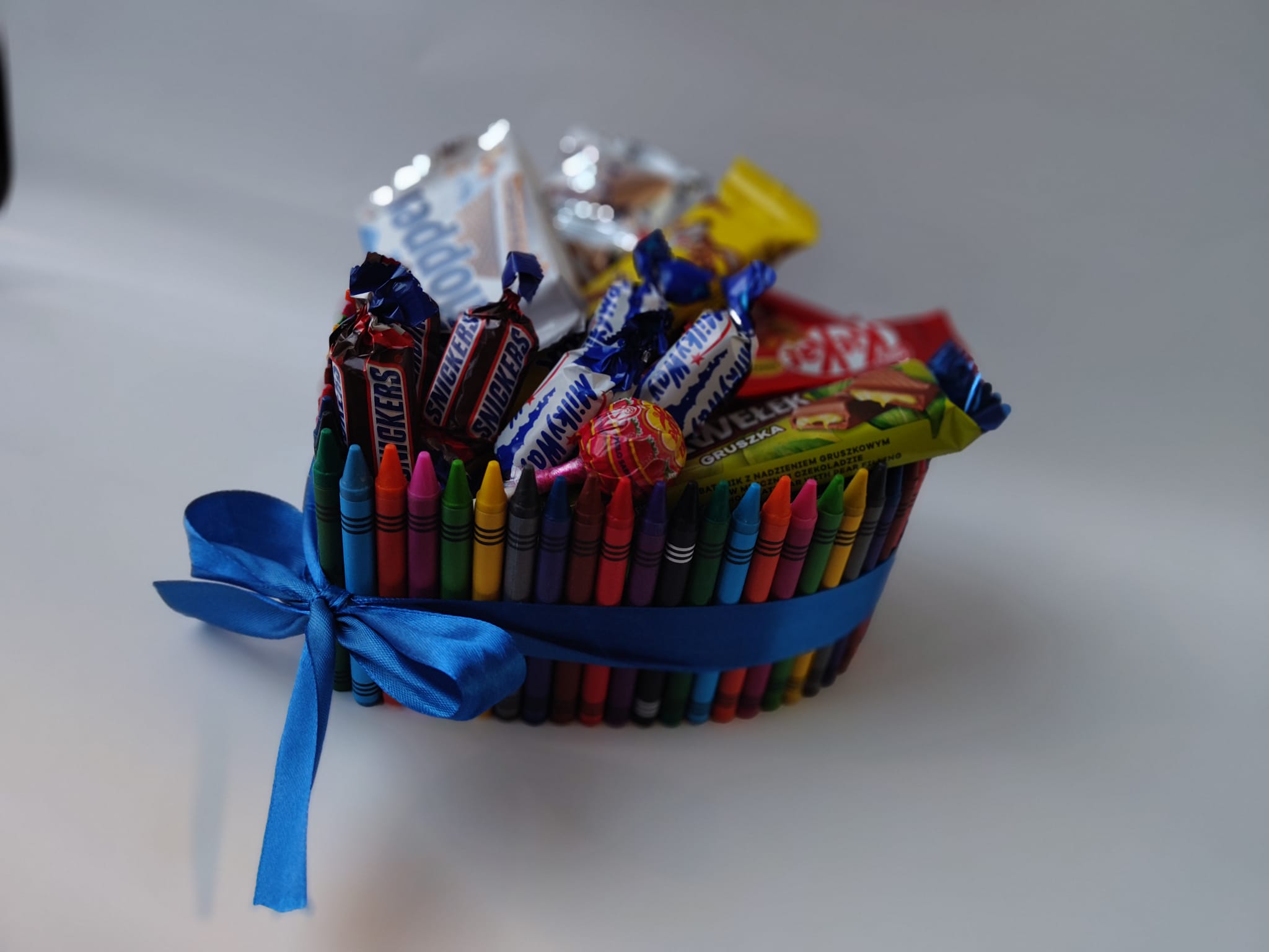 Tort w kształcie serca, obwódką z kredek świecowych. Wypełnienie to miks różnych łakoci. Całość obwiązana estetyczną wstążką.