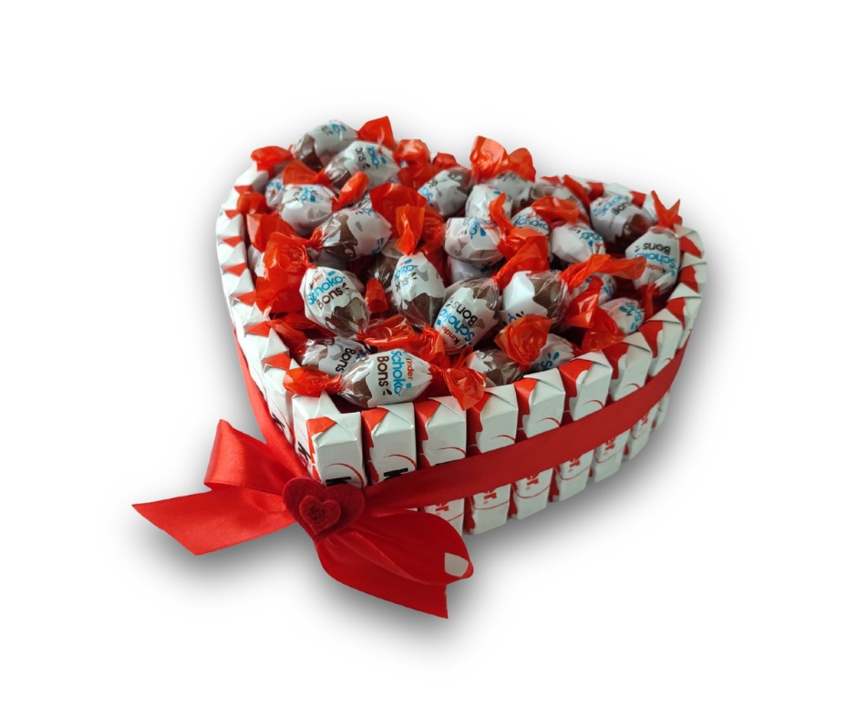 Tort w kształcie serca, obwódka z kinder czekolady, a wypełnienie z schoko bons. Idelny dla dzieci.